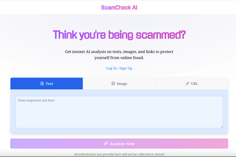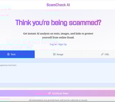 ScamCheck Ai is a a simple web-based, mobile-friendly application that helps users instantly identify potential scams. The tool leverages AI to analyze and detect contents from users and suggests recommended actions based on the results. Simply input text messages, upload screenshots, or paste URLs to receive an immediate risk assessment and actionable advice on what to do next.